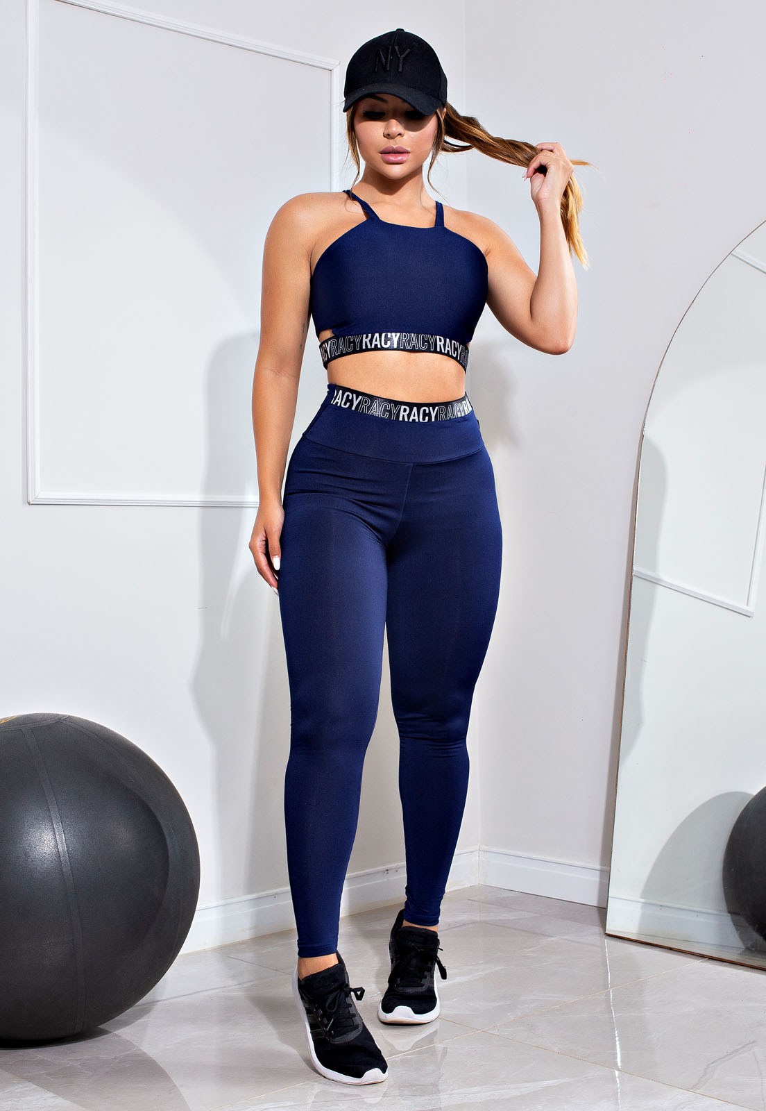 Conjunto Fitness Calça Legging Cintura Alta + Cropped Alcinha Marinho com Elásticos